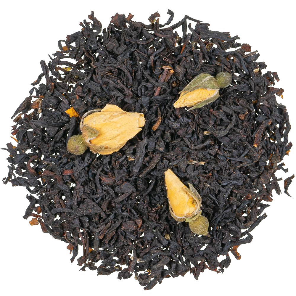 thé noir de Ceylan, thé noir du sud de l’Inde, thé noir de Chine, boutons de rose (4 %), arôme.